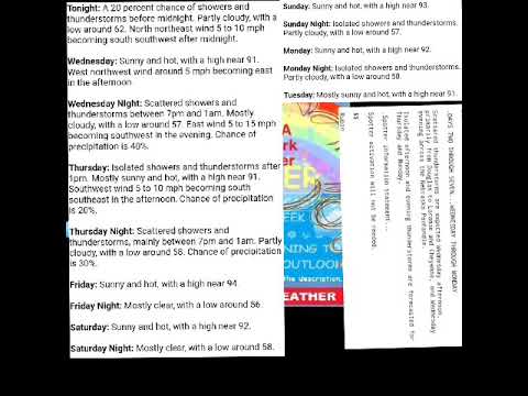 Thursday: Isolated showers and thunderstorms after 1pm. Mostly sunny and hot, with a high near 91. Southwest wind 5 to 10 mph becoming south southeast in the afternoon. Chance of precipitation is 20%.