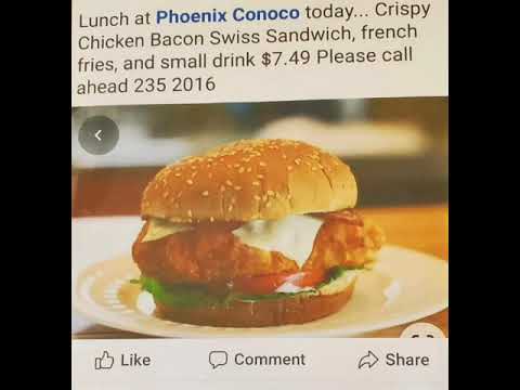 Lunch at Phoenix Conoco today is Crispy Chicken Bacon Swiss Sandwich, french fries, and small drink for $7.49. Please call ahead 235-2016.