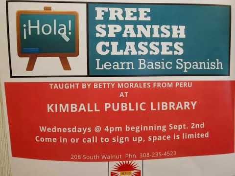 THERE ARE FREE SPANISH CLASSES TAUGHT BY BETTY MORALES FROM PERU AT THE KIMBALL PUBLIC LIBRARY AT 208 SOUTH WALNUT STREET! Wednesday Evenings at 4pm Beginning September 2nd. Come in or call to sign up, space is limited. Call (308) 235-4523 to sign up.